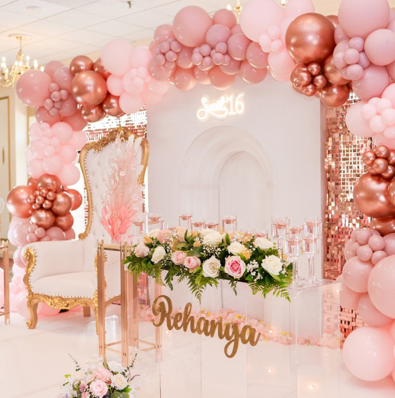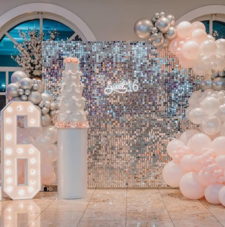 A glamorous Sweet Sixteen setup with shimmer walls and elegant balloons.